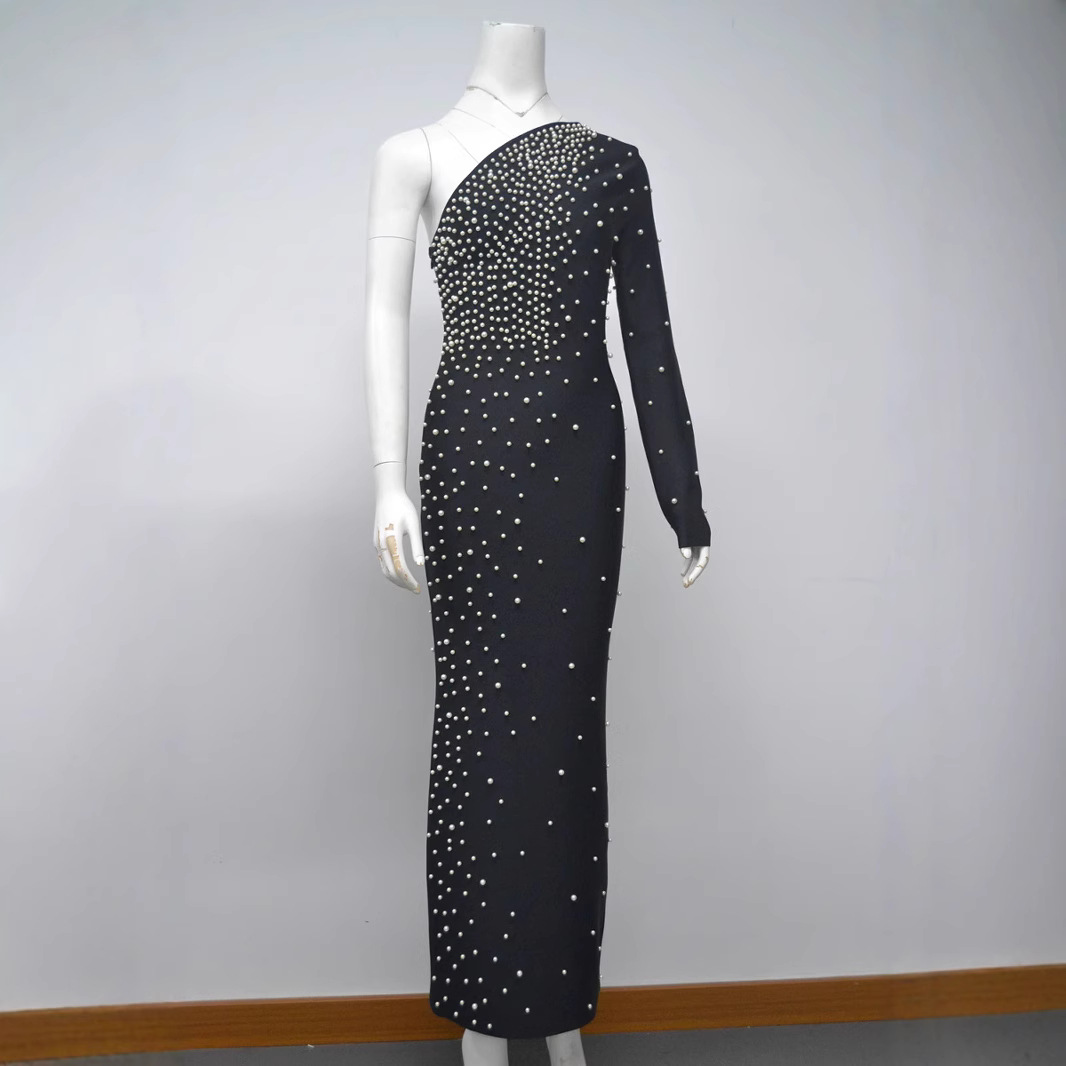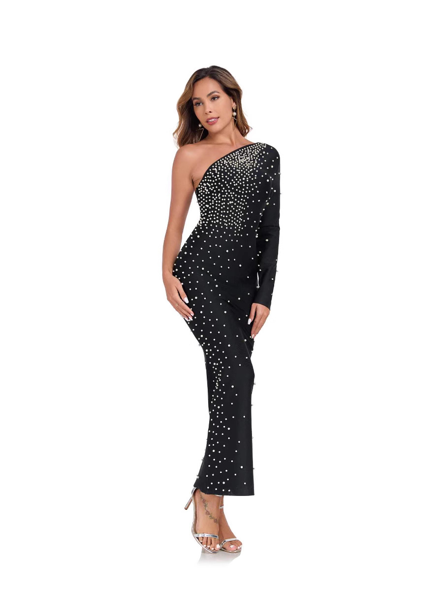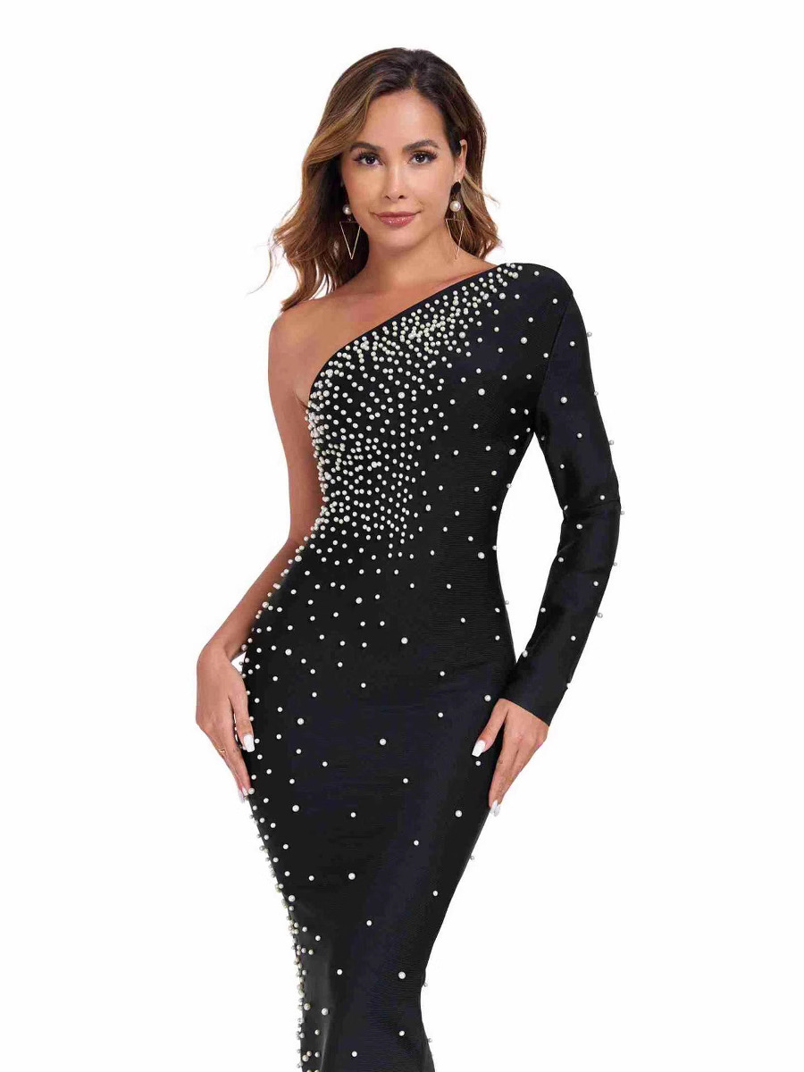 Women's Elegant Black One-Shoulder Beaded Bandage Dress – Party Evening Gown