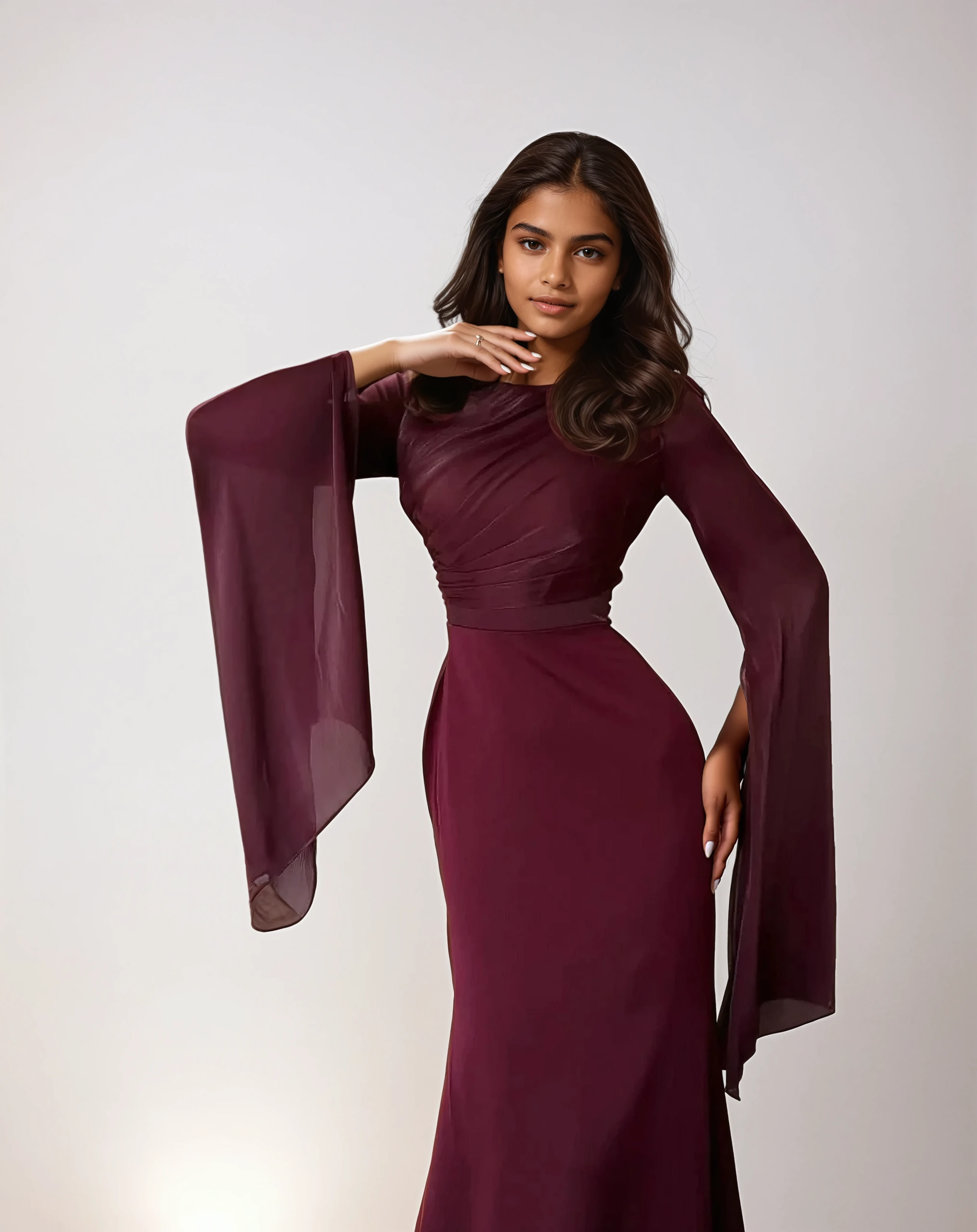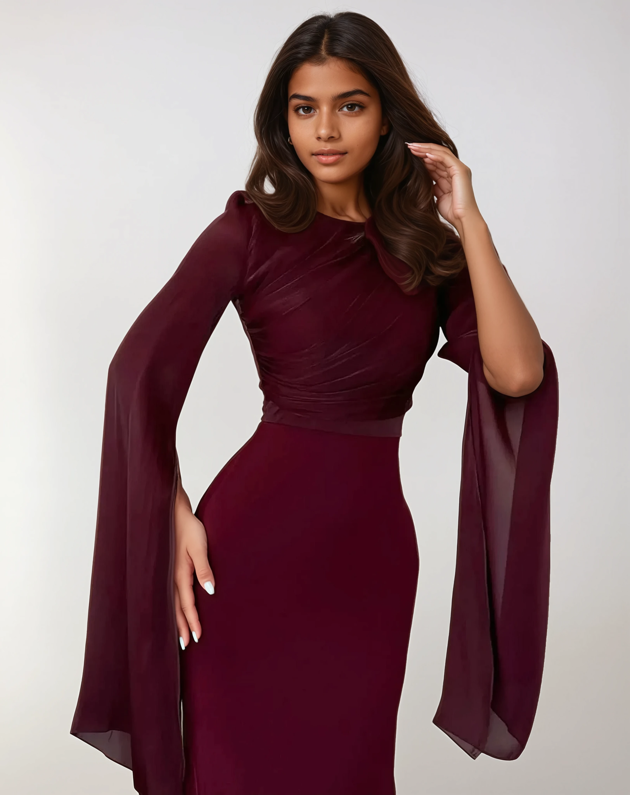 Burgundy Satin Maxi Evening Dress – Modest Fit with Split Sleeve Detail