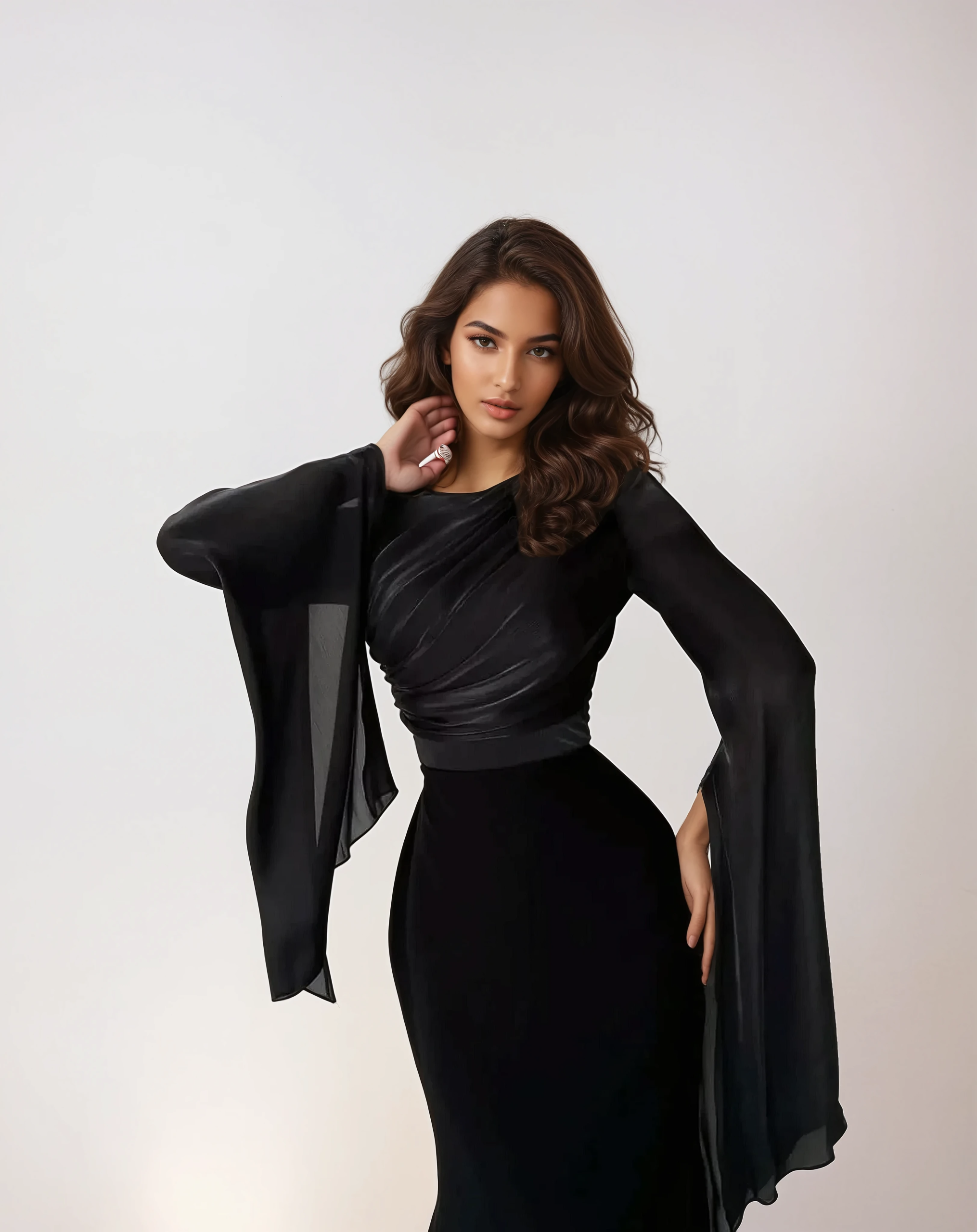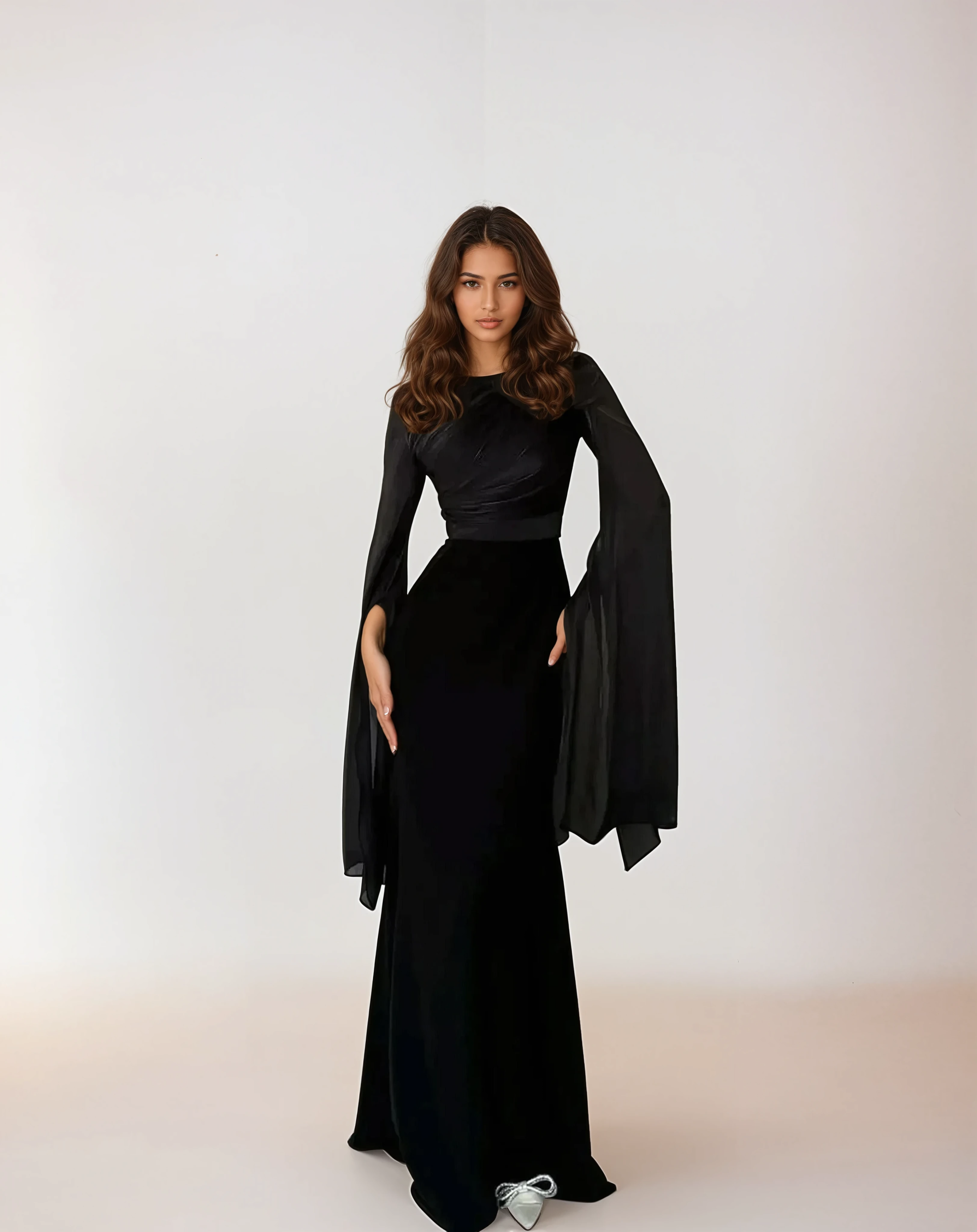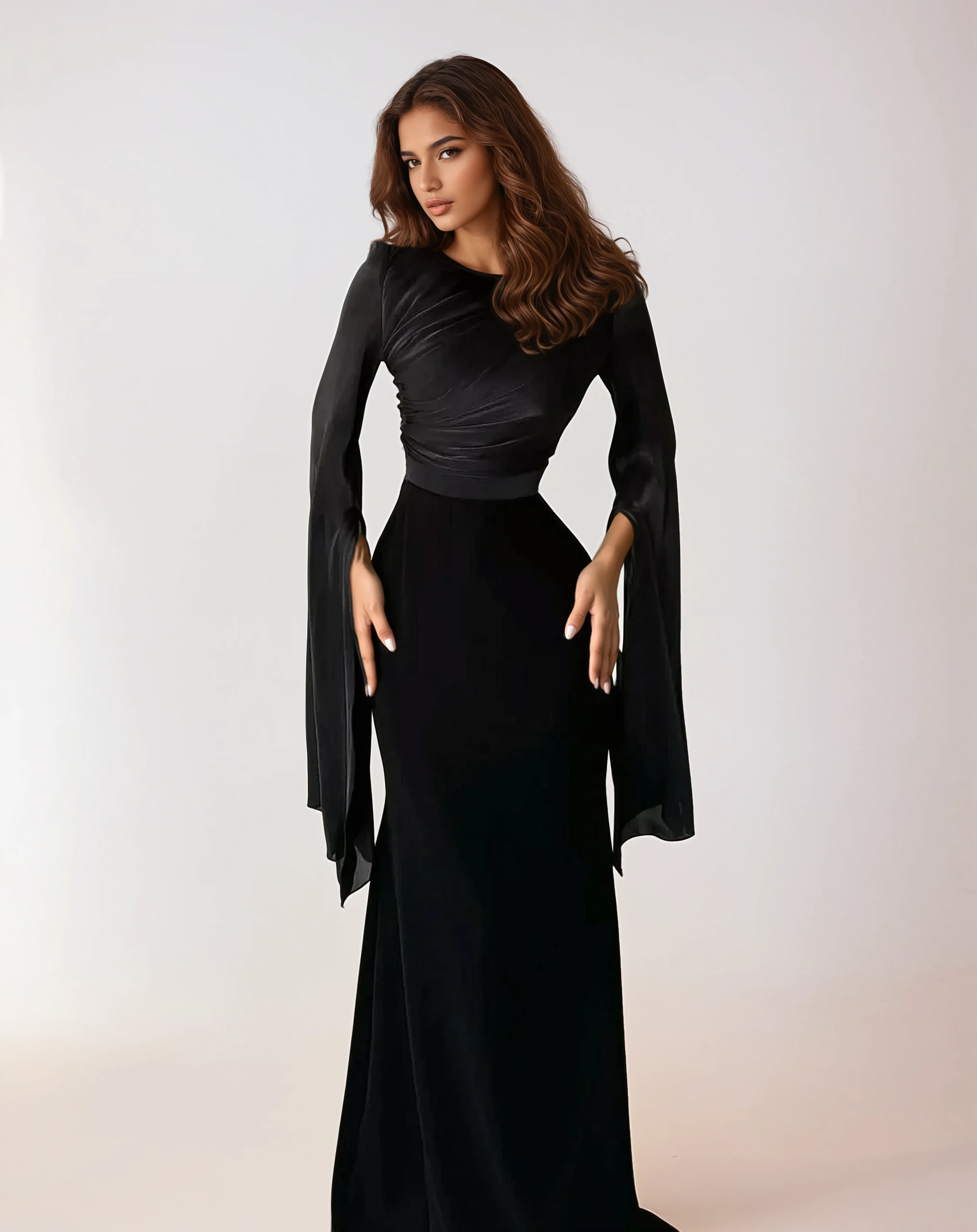 Elegant Black Satin Maxi Dress with Split Sleeves – Modest Evening Style