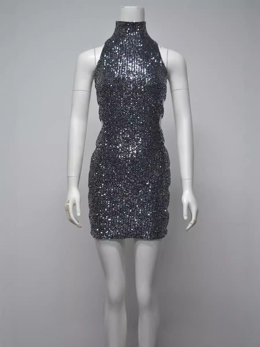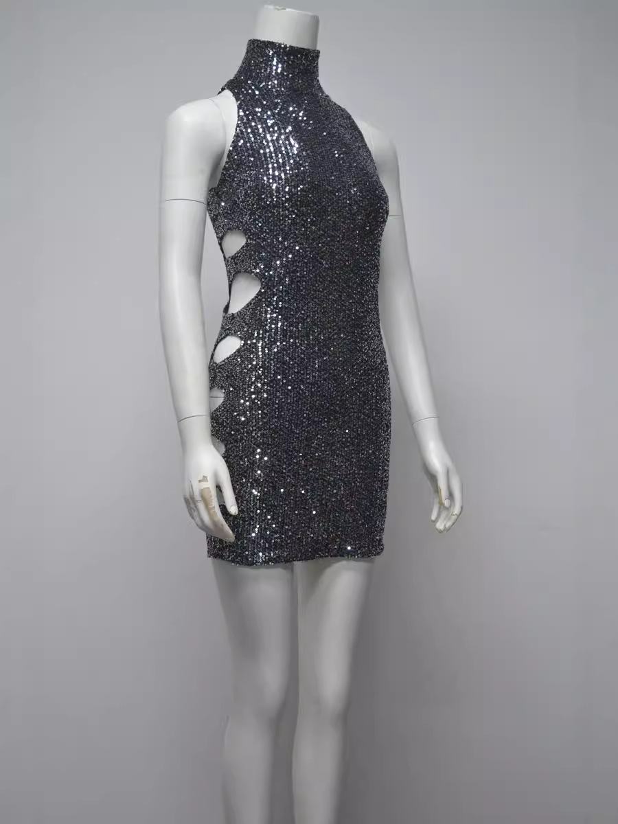 Women's Sequined Sleeveless Hip Skirt Dress – Glamorous Hollowed-Out Side Bodycon Gown